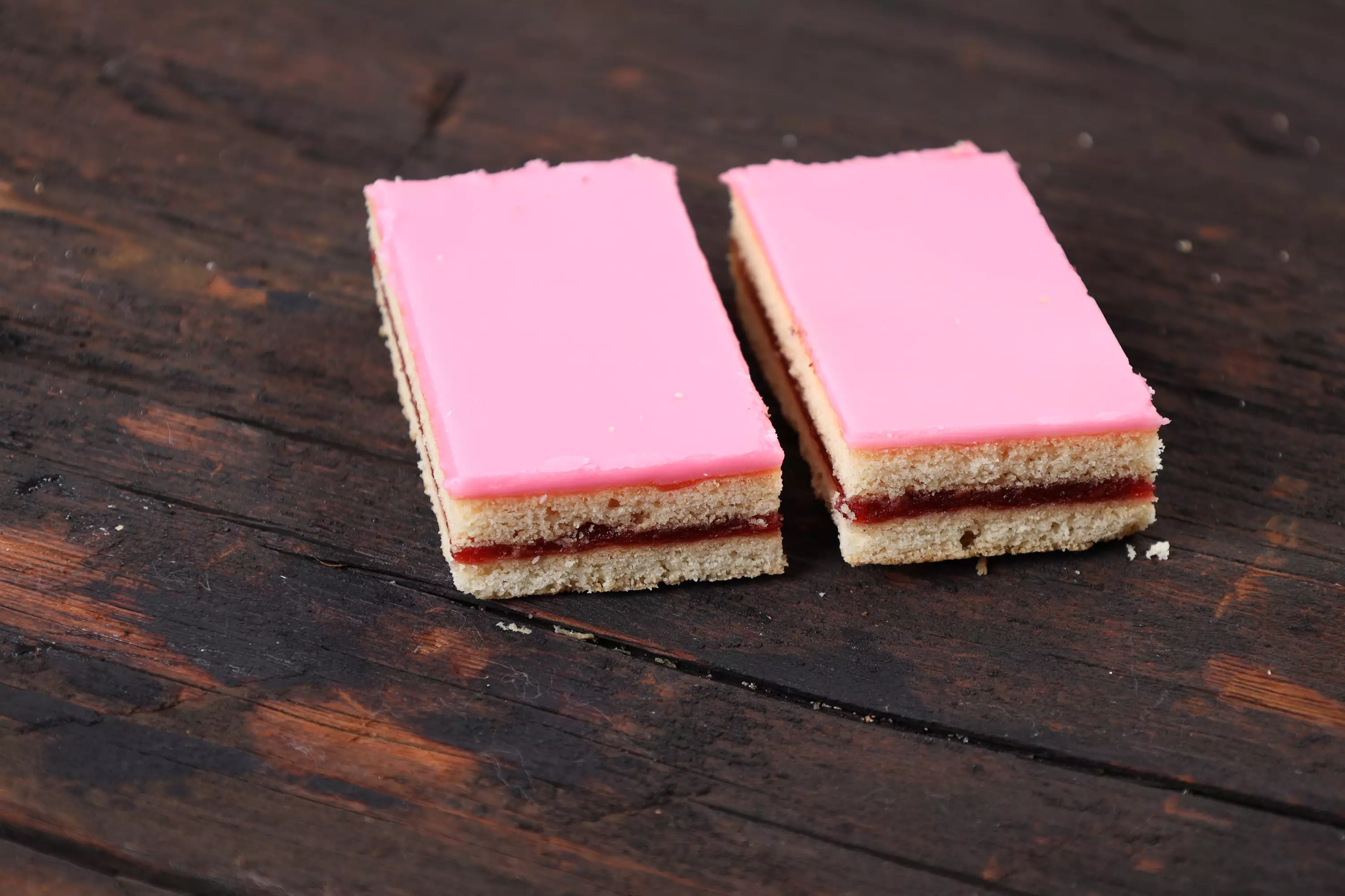 Vadelmahillolla täytetty sokerikuorrutteinen murotaikinaleivos.