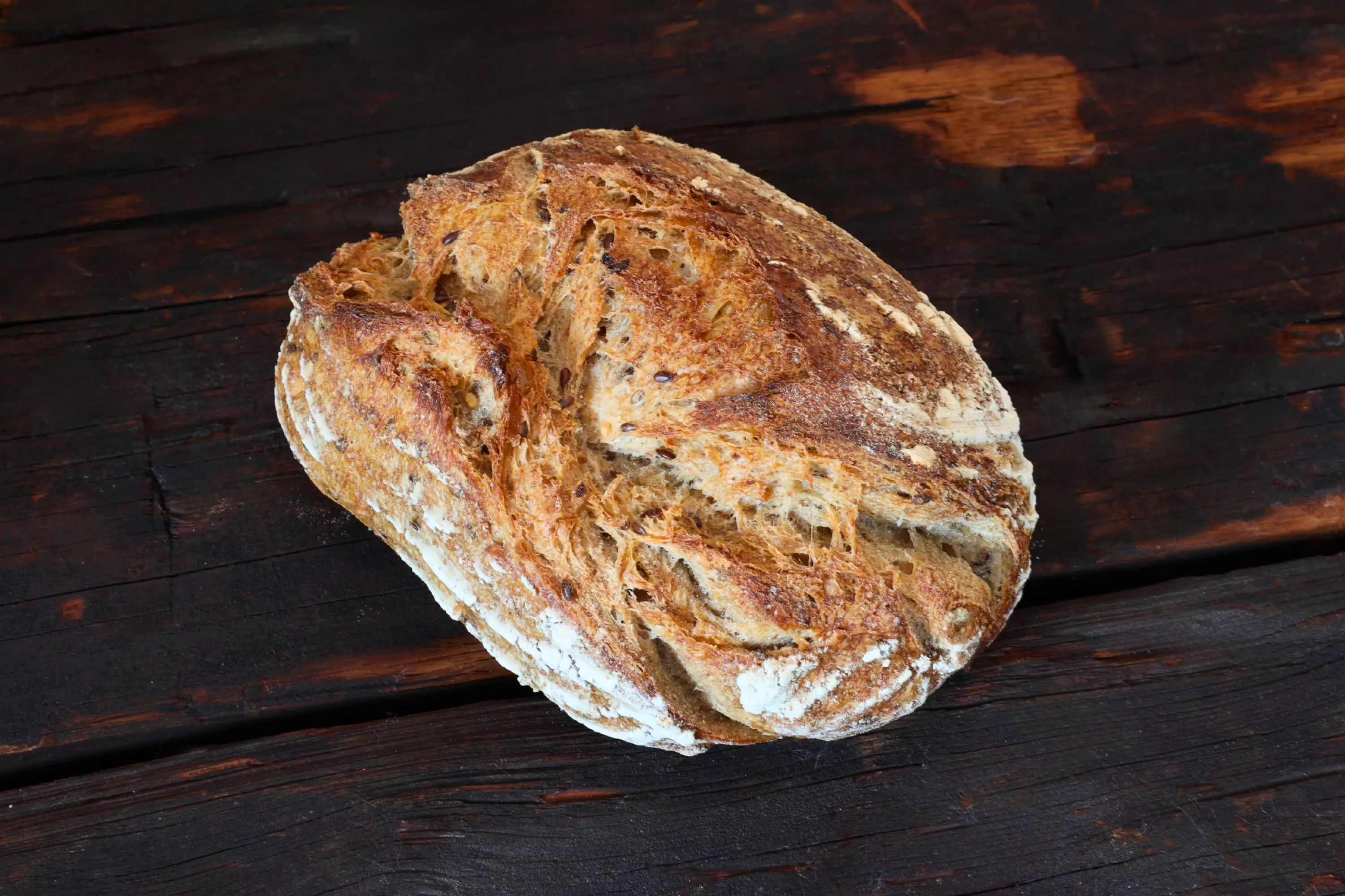 Jyväinen, rapeakuorinen ja rouhea hapanjuurileipä.