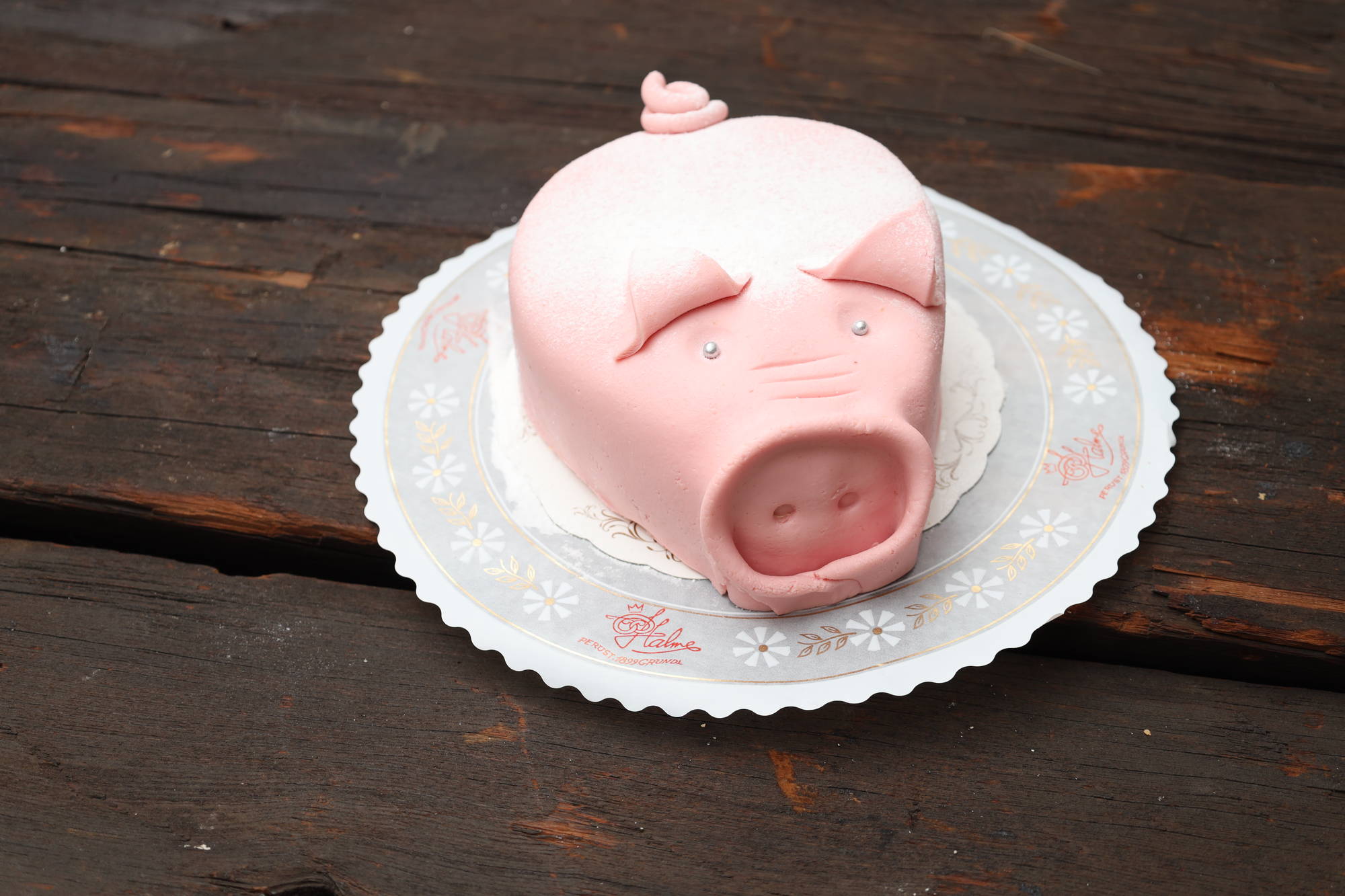 Vadelmahillolla ja voikreemillä täytetty sokerikakkupohja, kostutettu ananaksen makuisella sokerivedellä. Koristus: Marsipaani ja tomusokeri.