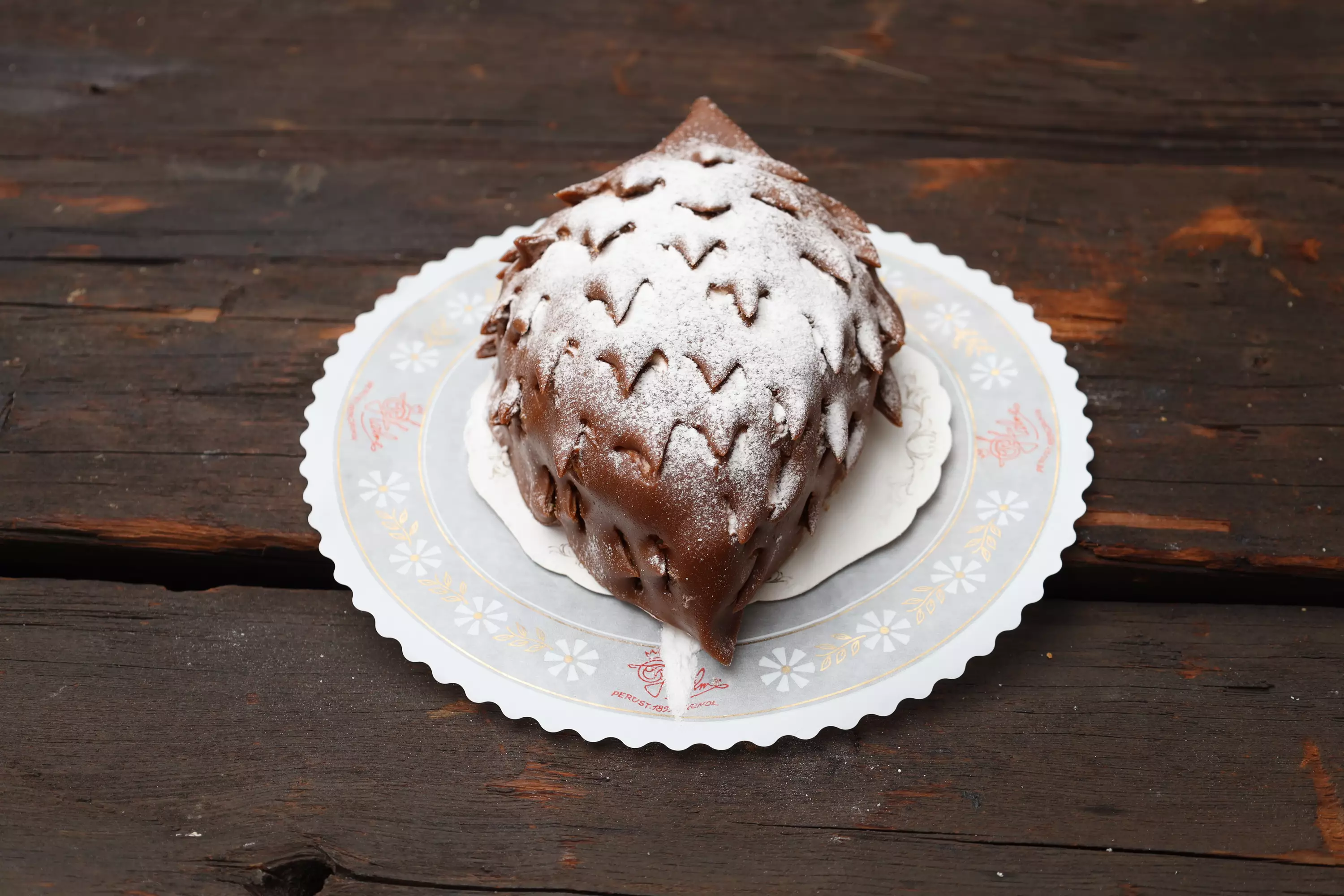 Marsipaanilla kuorrutettu perinteinen käpykakku täytteenä suklaakreemiä, vadelmahilloa ja marenkia.