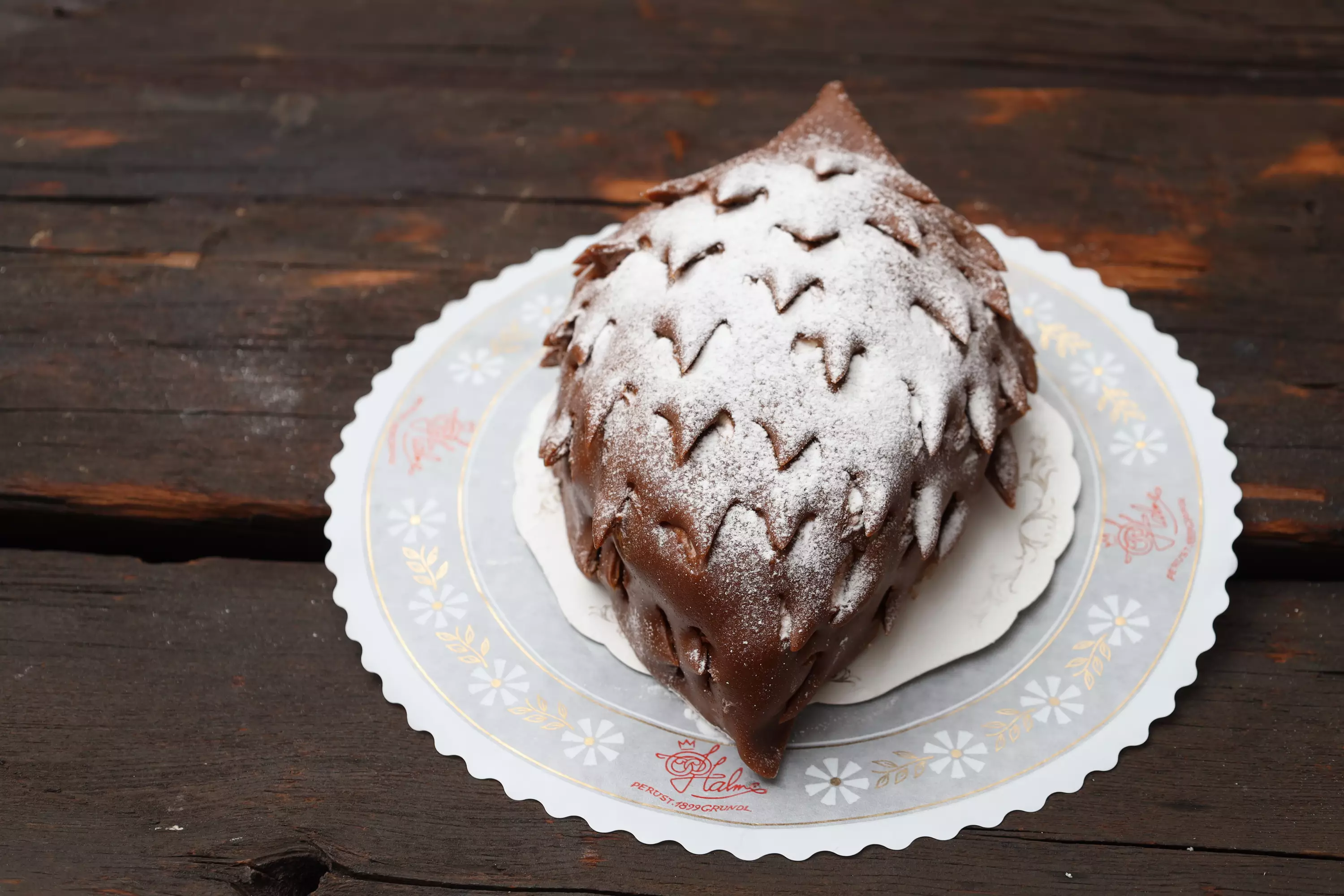 Marsipaanilla kuorrutettu perinteinen käpykakku täytteenä suklaakreemiä, vadelmahilloa ja marenkia.