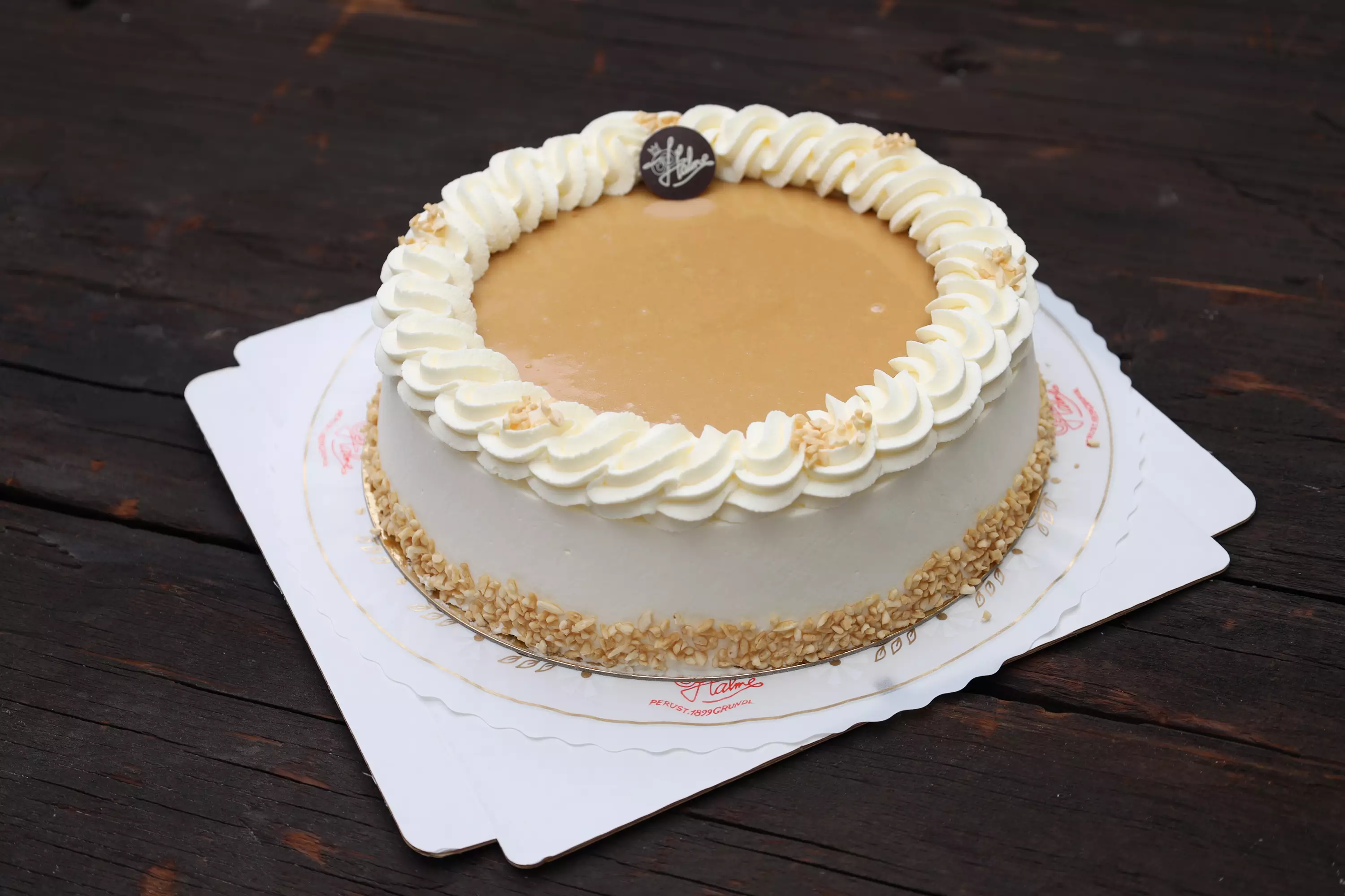 Kinuskivoikreemillä täytetty sokerikakkupohja, kostutettu ananas mehulla. Koristus: Kinuski, kerma ja krokantti.