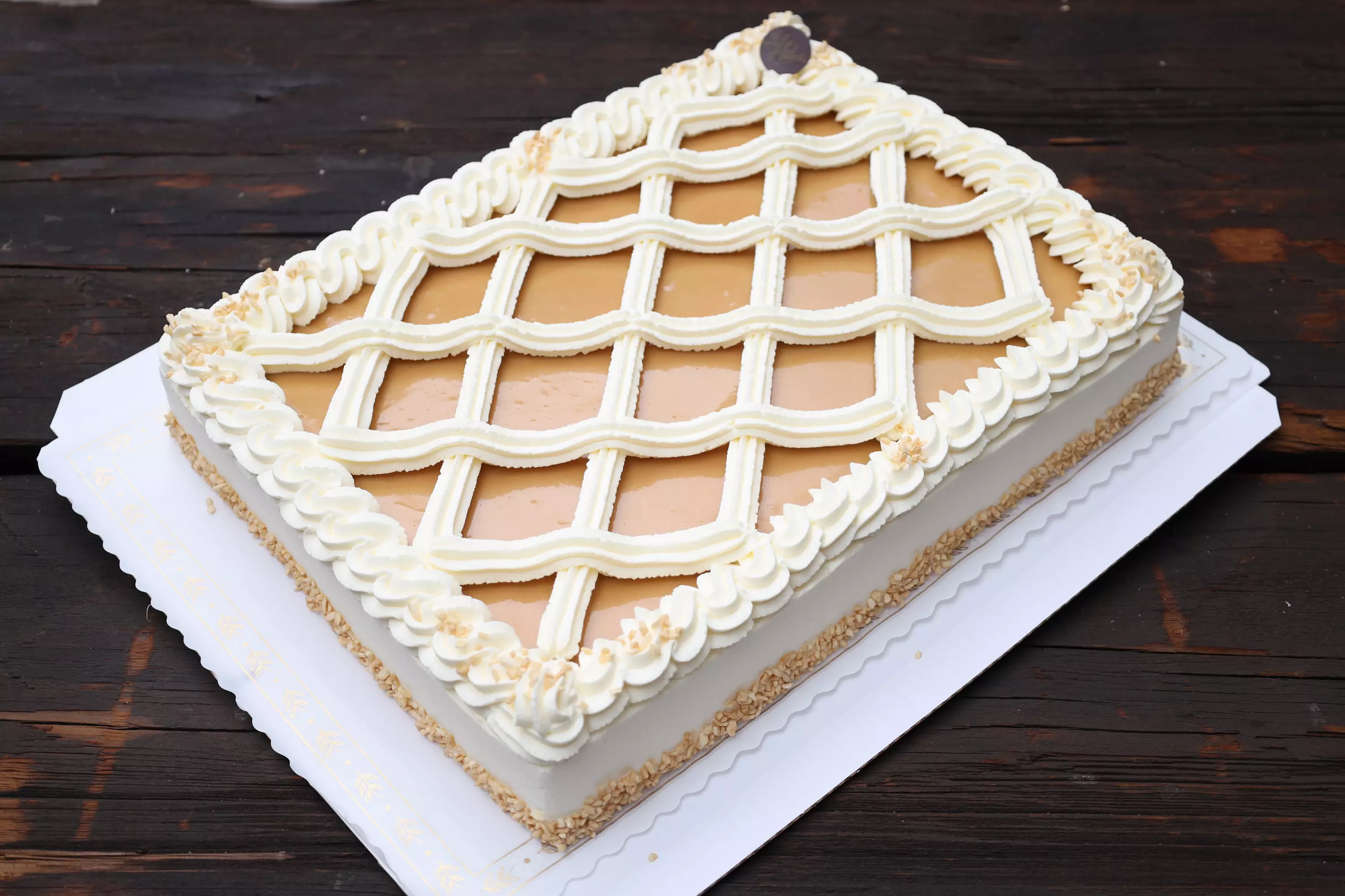 Kinuskivoikreemillä täytetty sokerikakkupohja, kostutettu ananasmehulla. Koristus: Kinuski, laktoositon kerma ja krokantti.