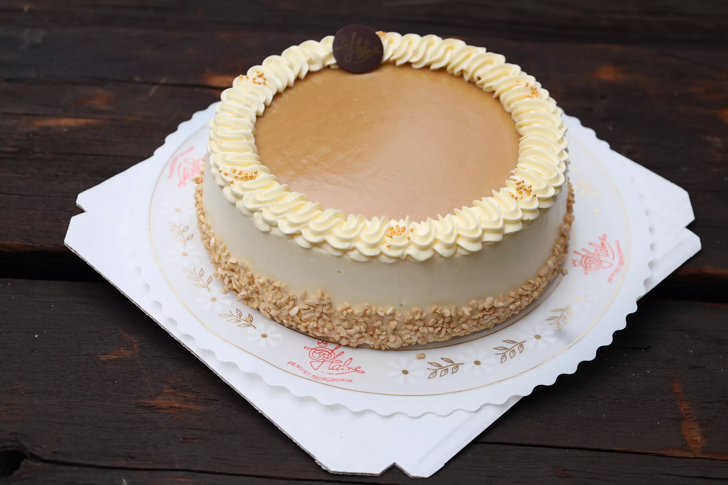 Kinuskivoikreemillä täytetty sokerikakkupohja, kostutettu ananas mehulla. Koristus: Kinuski, voikreemi ja krokantti.