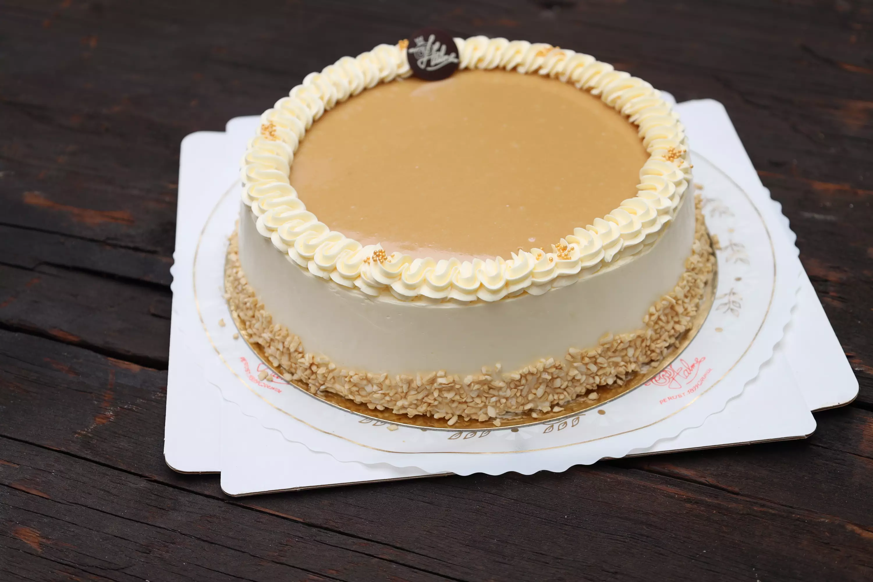 Kinuskivoikreemillä täytetty sokerikakkupohja, kostutettu ananas mehulla. Koristus: Kinuski, voikreemi ja krokantti.