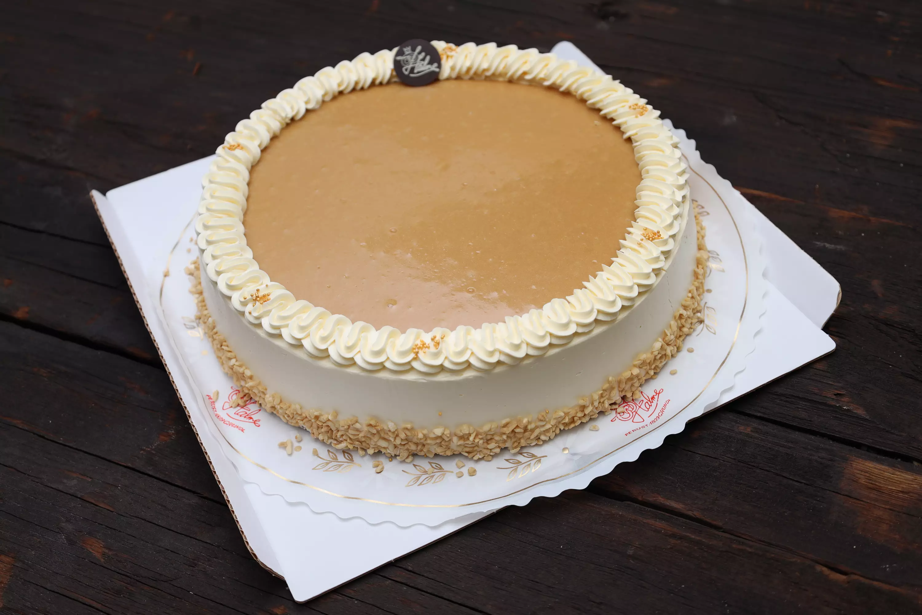 Kinuskivoikreemillä täytetty sokerikakkupohja, kostutettu ananas mehulla. Koristus: Kinuski, voikreemi ja krokantti.
