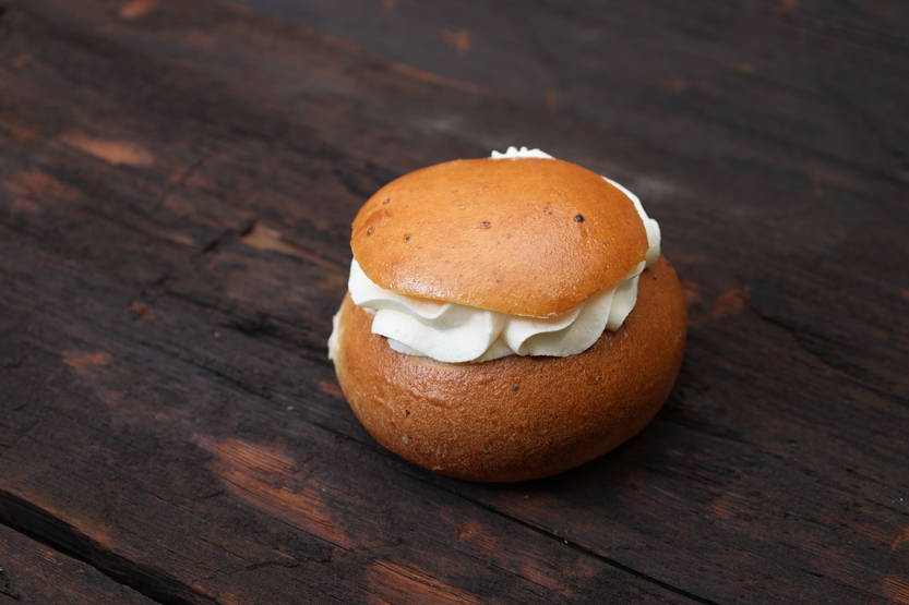 Muhkea laskiaispulla vadelmahillolla ja aidolla kermalla