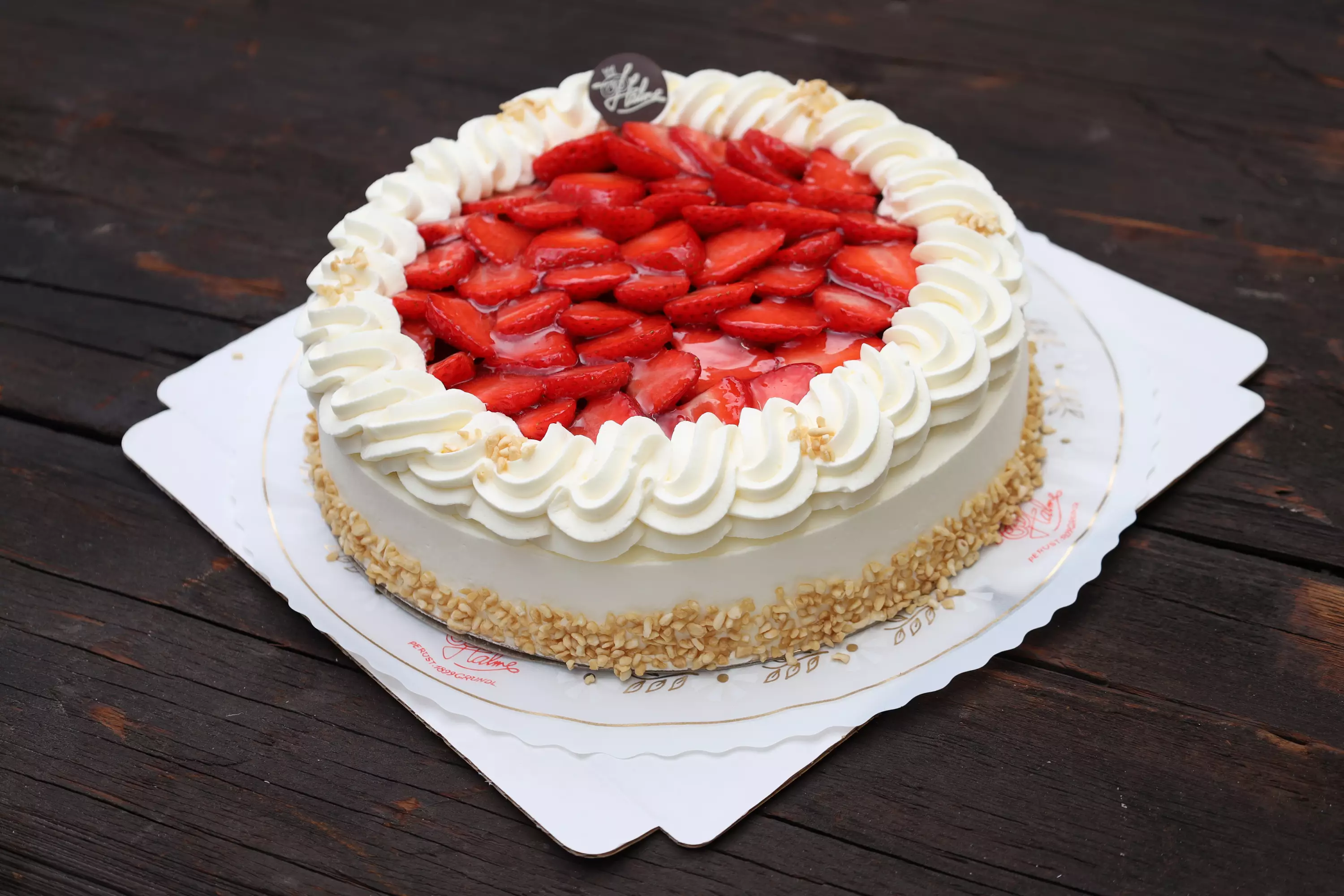 Mansikkahillolla ja kermalla täytetty sokerikakkupohja, kostutettu ananasmehulla. Koristus: Mansikka, koristehyytelö, laktoositon kerma ja krokantti.