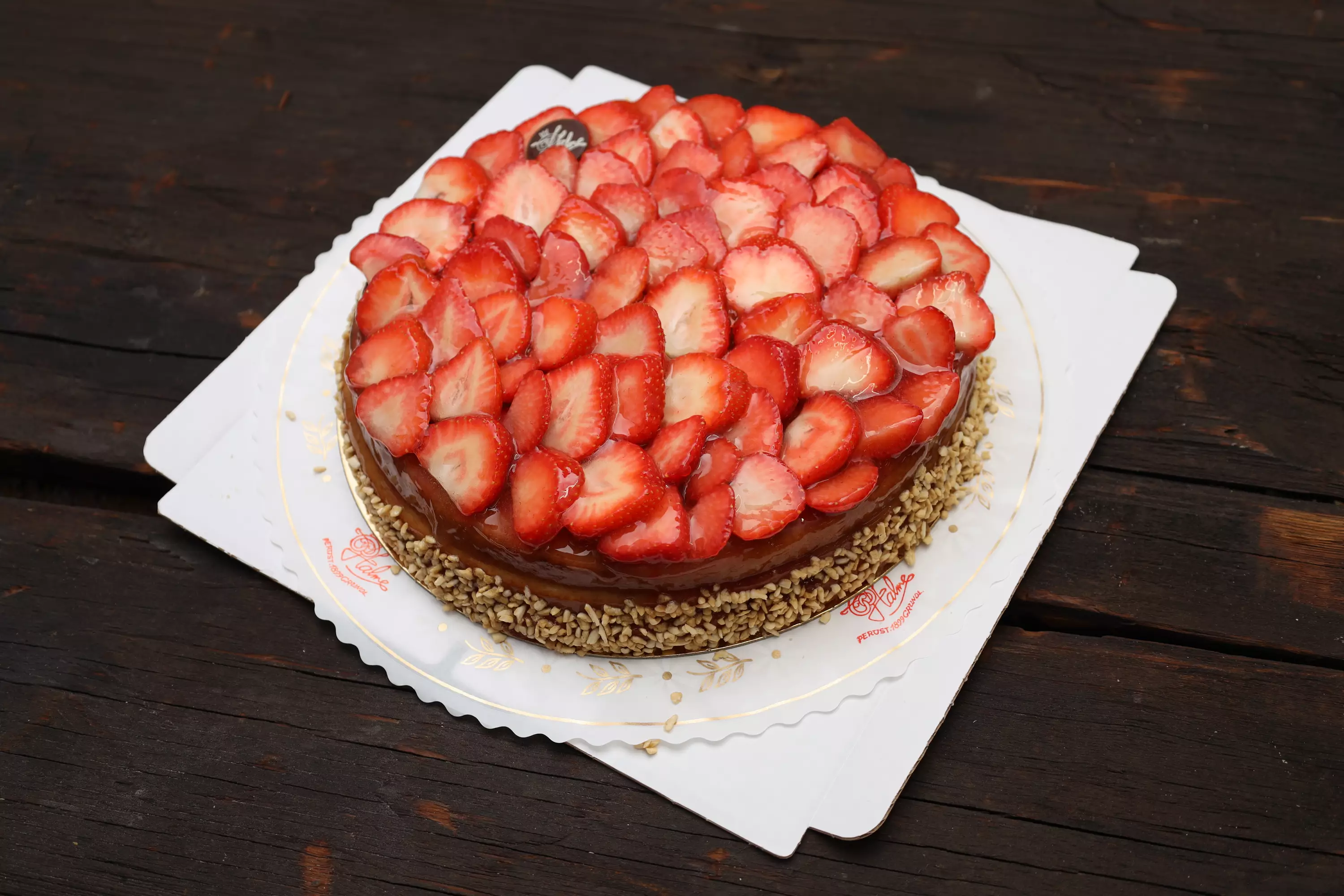 Mansikkahillolla täytetty sokerikakkupohja. Kostutettu ananasmehulla. Koristus: Mansikka, koristehyytelö ja krokantti.