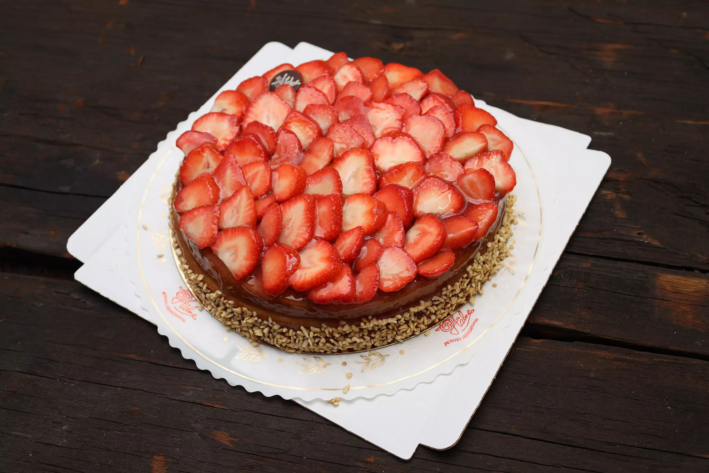 Mansikkahillolla täytetty sokerikakkupohja. Kostutettu ananasmehulla. Koristus: Mansikka, koristehyytelö ja krokantti.