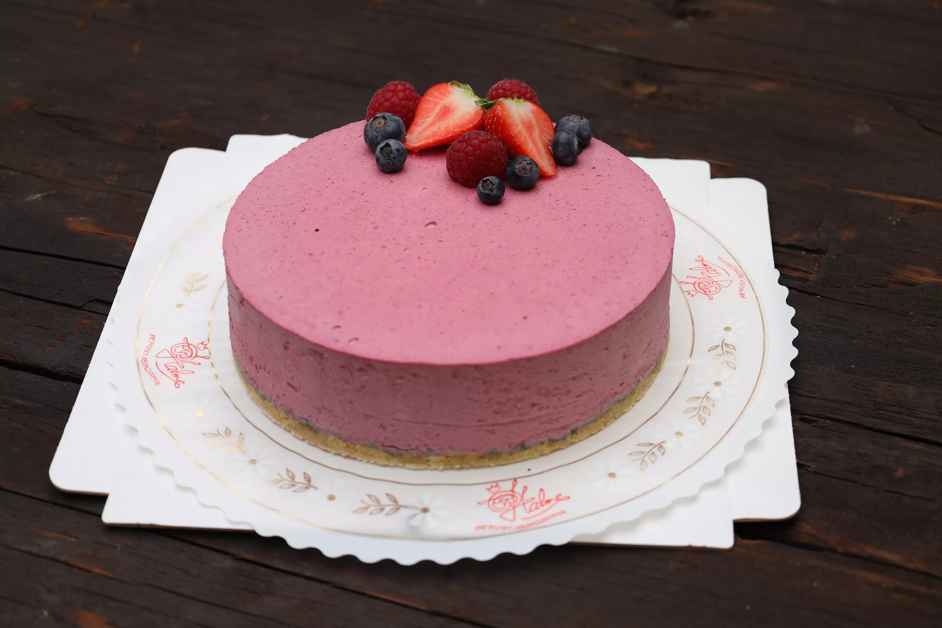 Digestive-keksipohja, raikas ja marjainen mustaherukkapyreellä maustettu tuorejuusto- ja kermamoussetäyte, koristeltu mansikoilla ja mustikoilla.