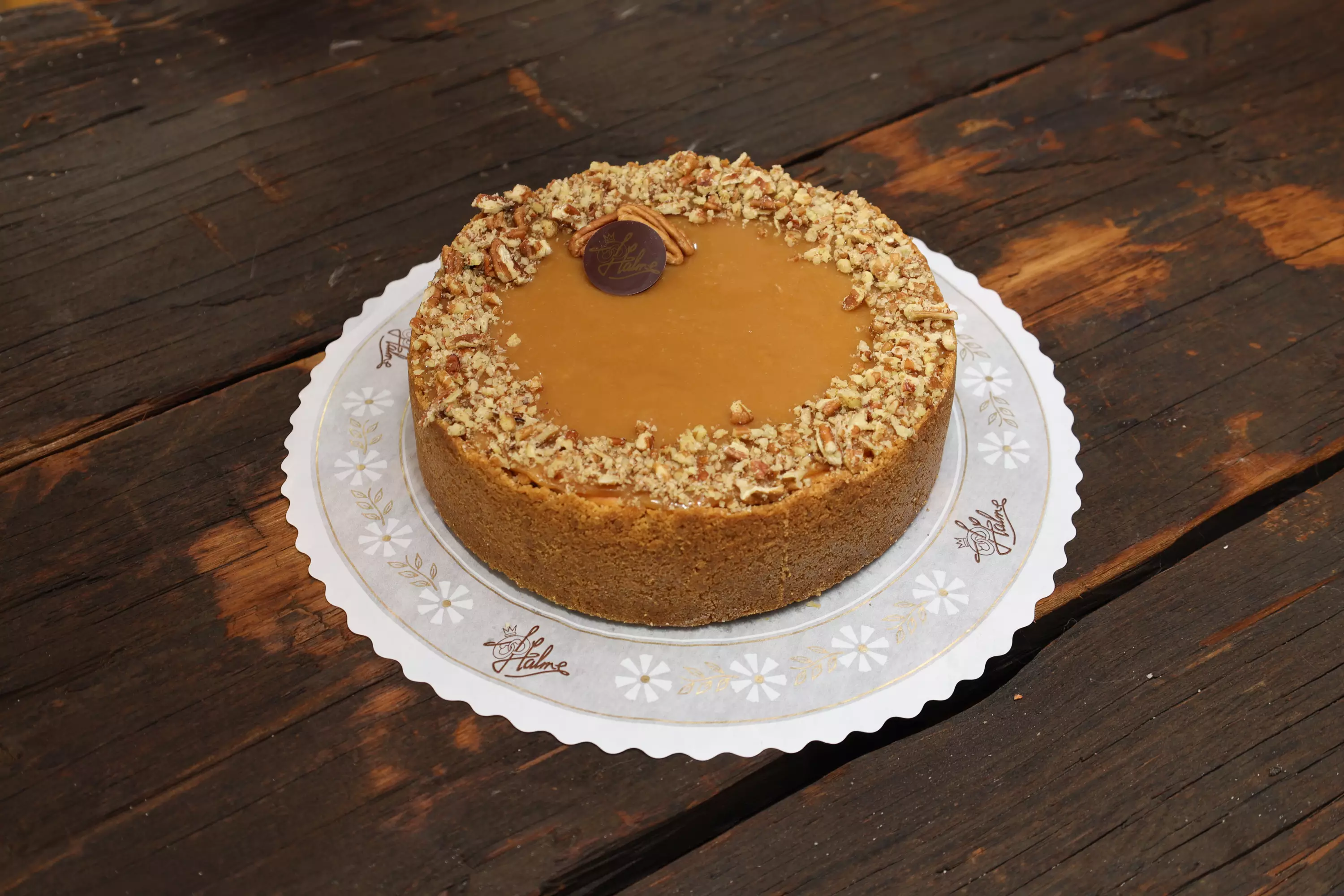 Täyteläinen paistettu juustokakku pekaanipähkinöillä ja kinuskikuorrutteella.