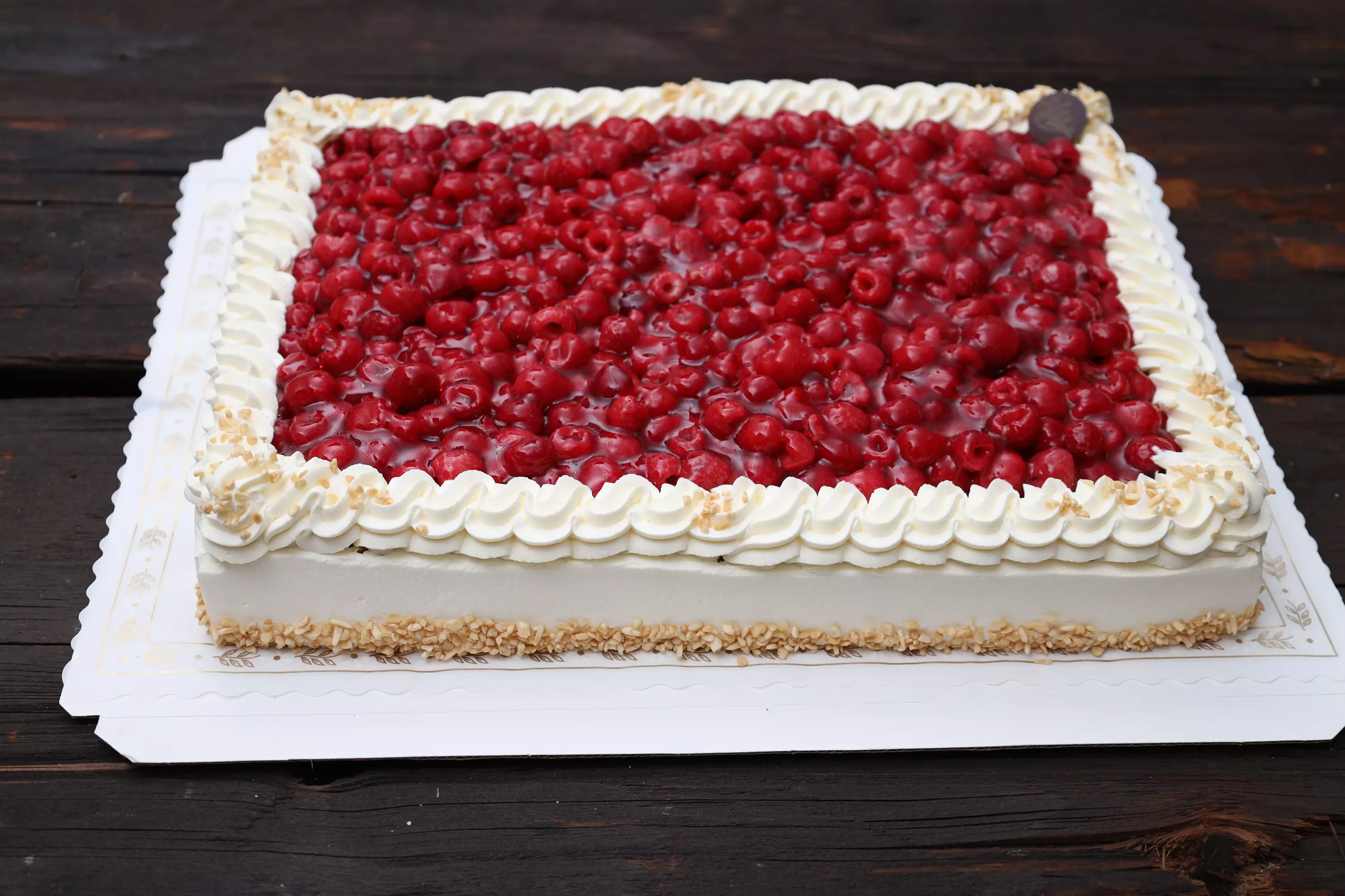 Vadelmahillolla ja kermalla täytetty sokerikakkupohja, kostutettu ananasmehulla. Koristus: Vadelma, koristehyytelö, laktoositon kerma ja krokantti.