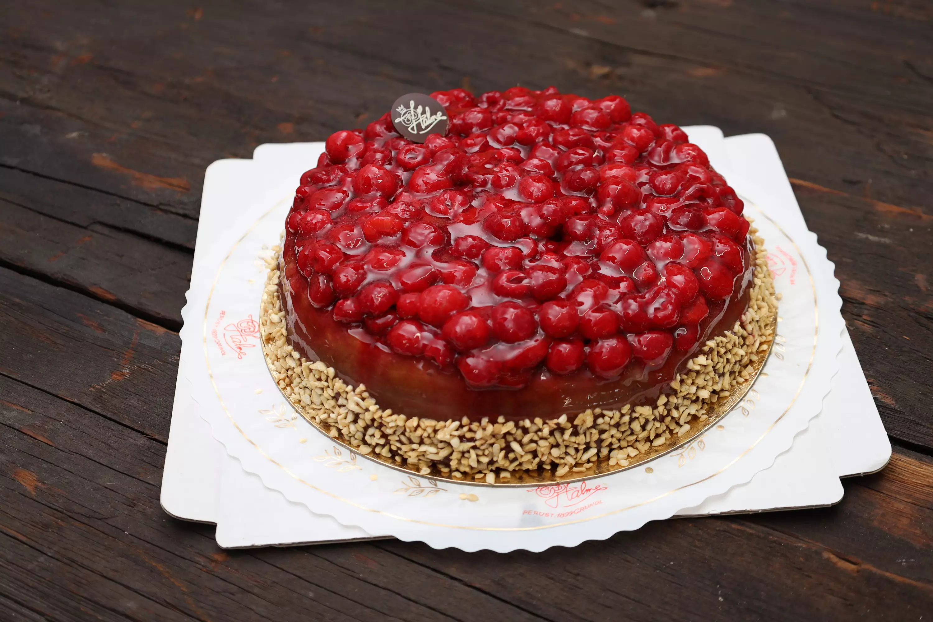 Vadelmahillolla täytetty sokerikakkupohja. Kostutettu ananasmehulla. Koristus: Vadelma, koristehyytelö ja krokantti.