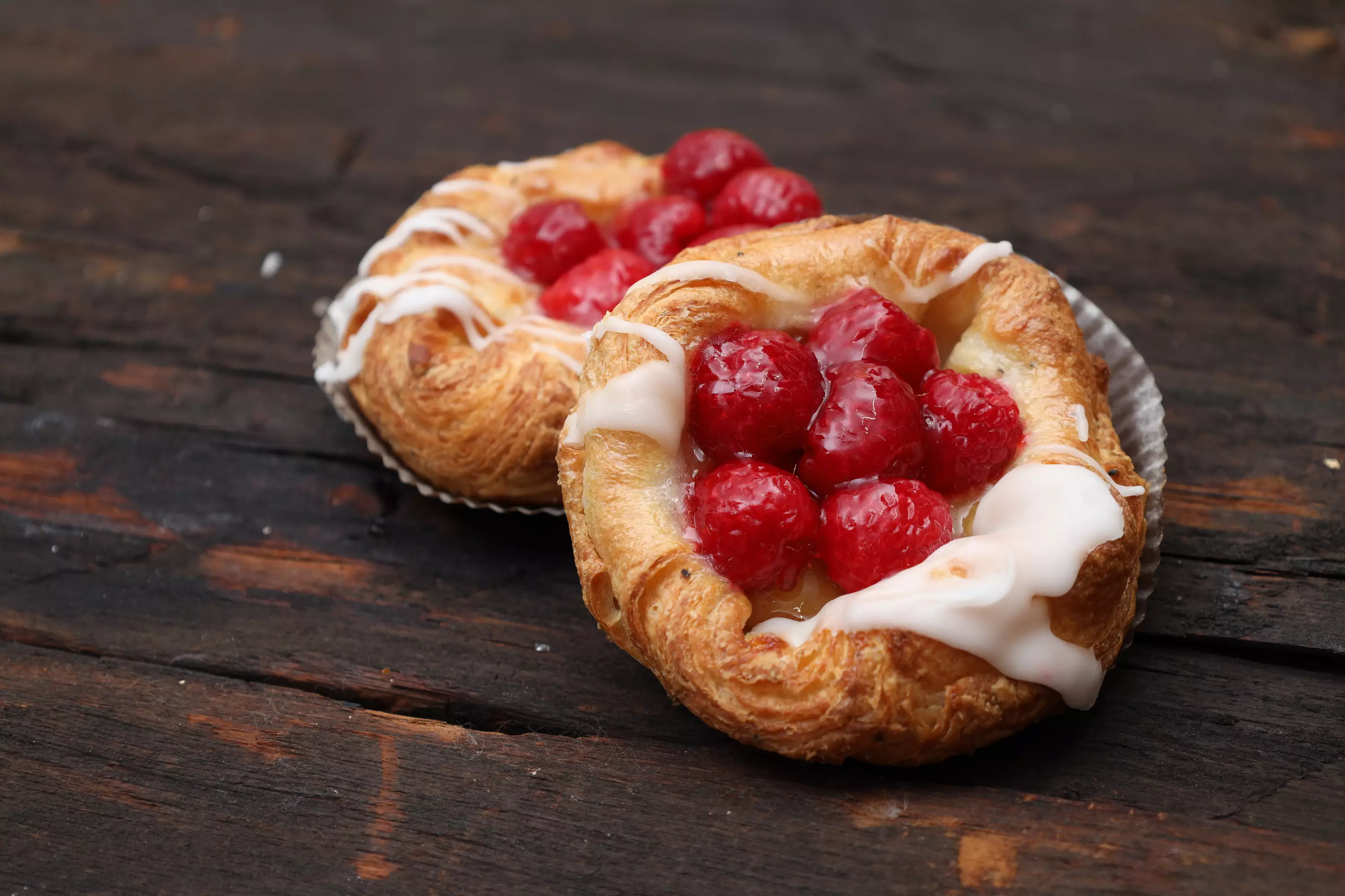 Kotimaisilla vadelmilla ja vaniljalla täytetty viineri.