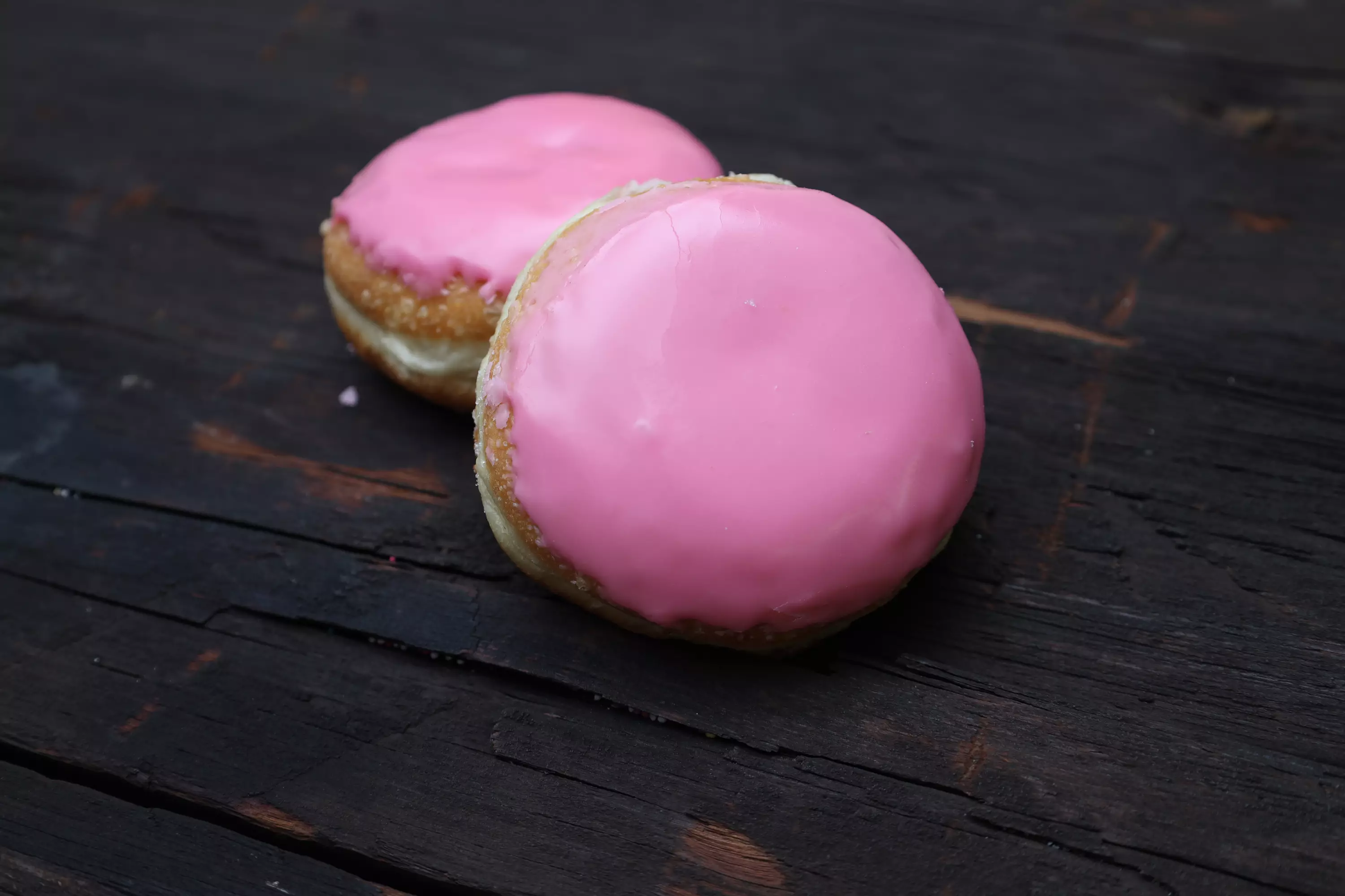 Traditionell berlinermunk med ljusröd pomada och äppelsyltfyllning