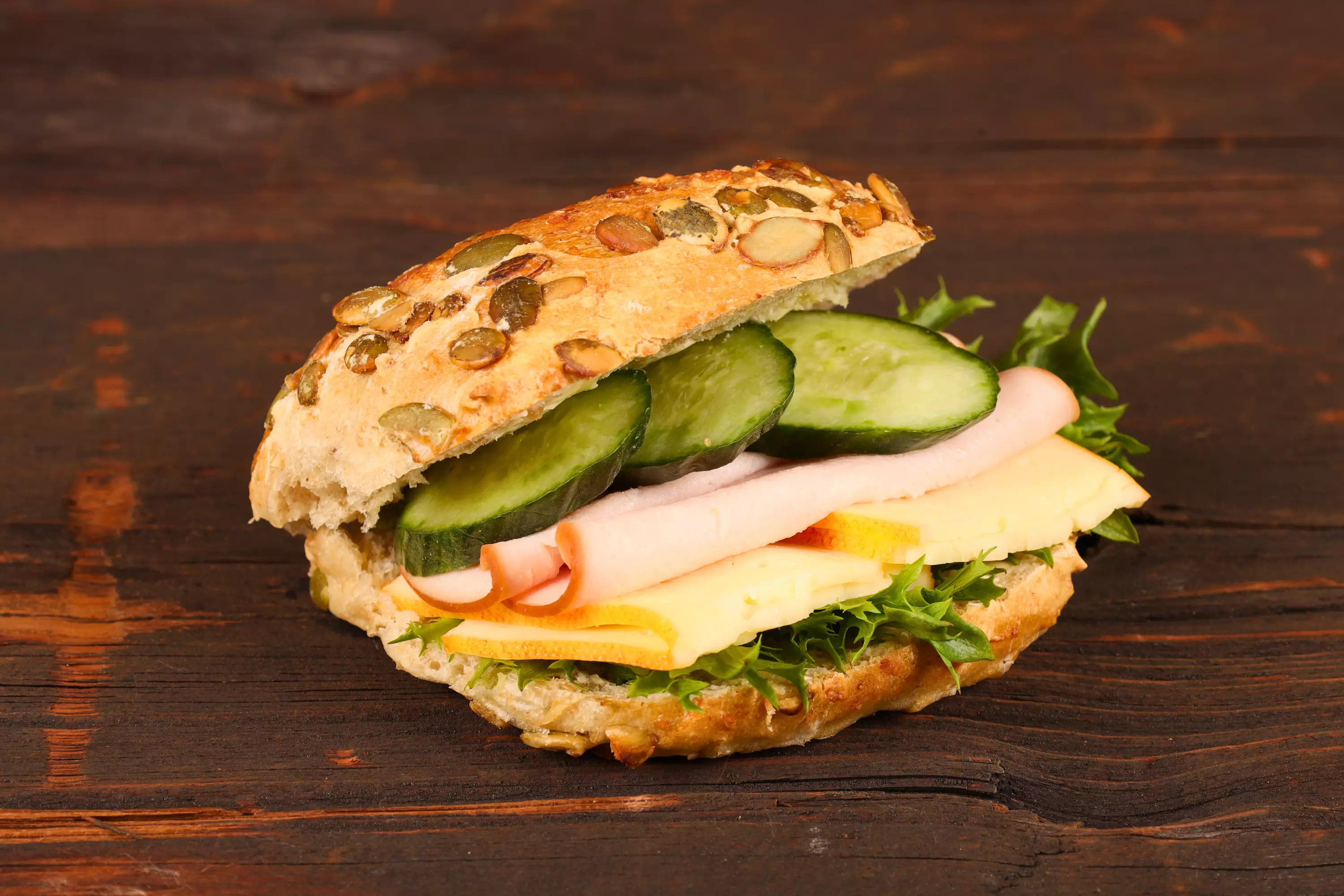 Ingredienser: Semla: VETEMJÖL, vatten, HAVRE 25% (HAVREKROSS, -FLINGOR, -KLI), pumpafrön, jäst, joderat salt, VETEGRODDAR, VETEGLUTEN. Fyllning: Laktosfritt oivariini; SMÖR, rypsolja, D-vitamin, sallad, Port Salut-ost: pastöriserad MJÖLK, syrningskultur, ystenzym, färg E160b (ii), finsk kalkonfilè, finsk kycklingfilè, stabiliseringsmedel (modifierad majs-och tapiokastärkelse, karragenan), mineralsalt (natrium- och kaliumklorid), potatisstärkelse, stärkelsesirap, dextros, antioxidationsmedel E301, konserveringsmedel E250, rökarom, gurka.